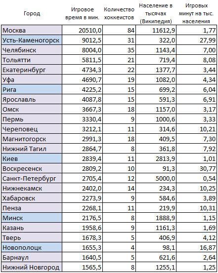 Сложно сравнивать рядом идущие Киев и Воскресенск, для этого в четвёртом столбце указаны игровые минуты на тысячу населения, в этом случае у Киева разница в 30 раз меньше.