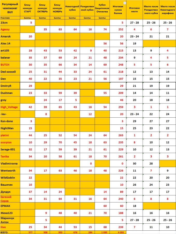 Продолжаем наши хоккейные интернет-конкурсы. Доигрываем регулярный чемпионат ВХЛ. Все баллы, набранные в Новогоднем марафоне сохраняются. Вторая часть регулярного чемпионата ВХЛ будет состоять из 2-х конкурсов. В январе будет разыгран Рождественский кубок. В феврале будет разыгран Кубок Защитника Отечества. Спонсоркая программа наших Партнёров в основном закончена, но всё-таки будут призы для победителей этих Кубков, для победителя регулярного Чемпионата и для победителя Плей-офф.