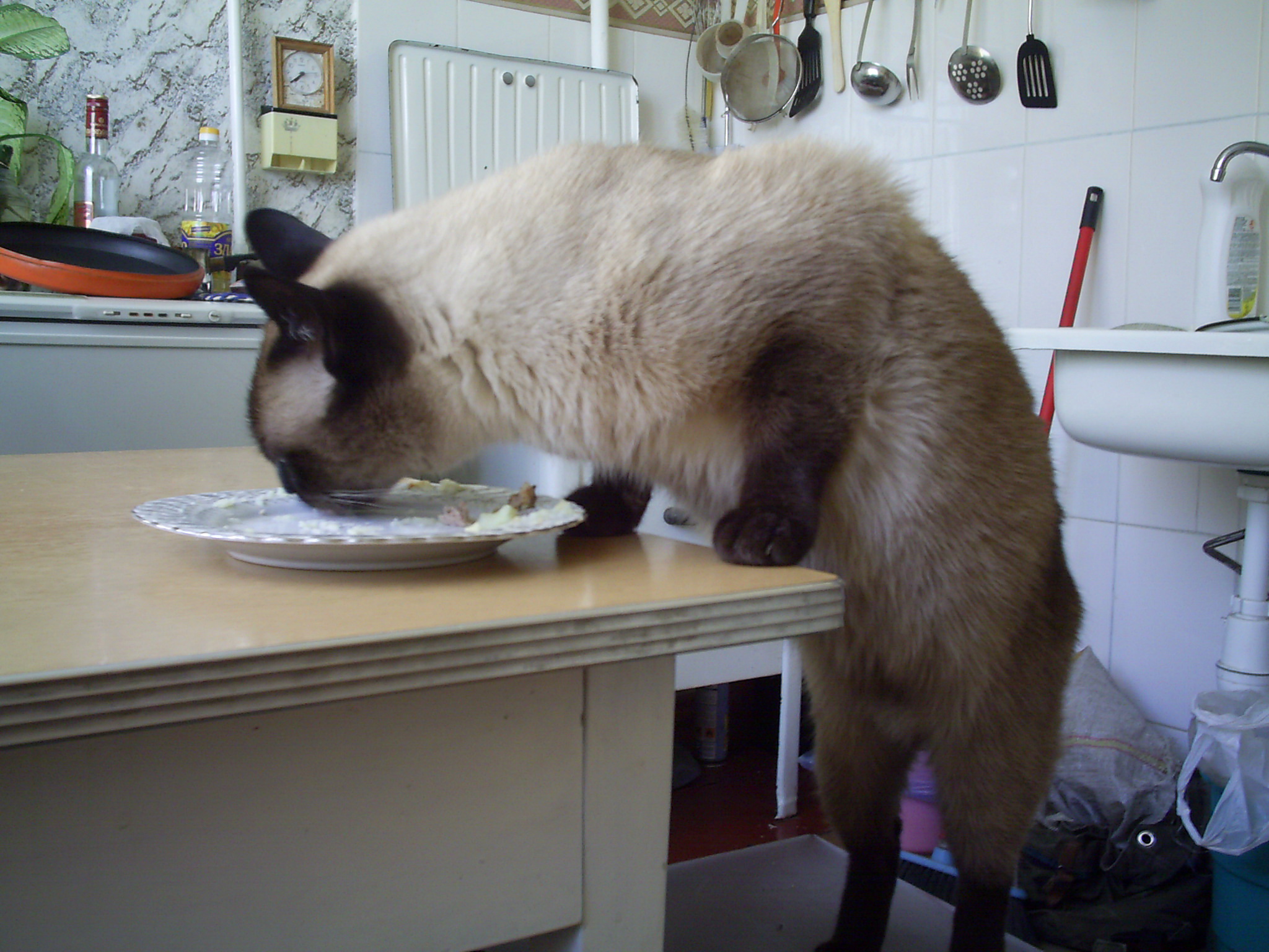 тама в левом верхнем углу бутылочка початая....с под чево? настоечка саракаградусная?)))))) а катейко, канешна, здря стоя ест)))))