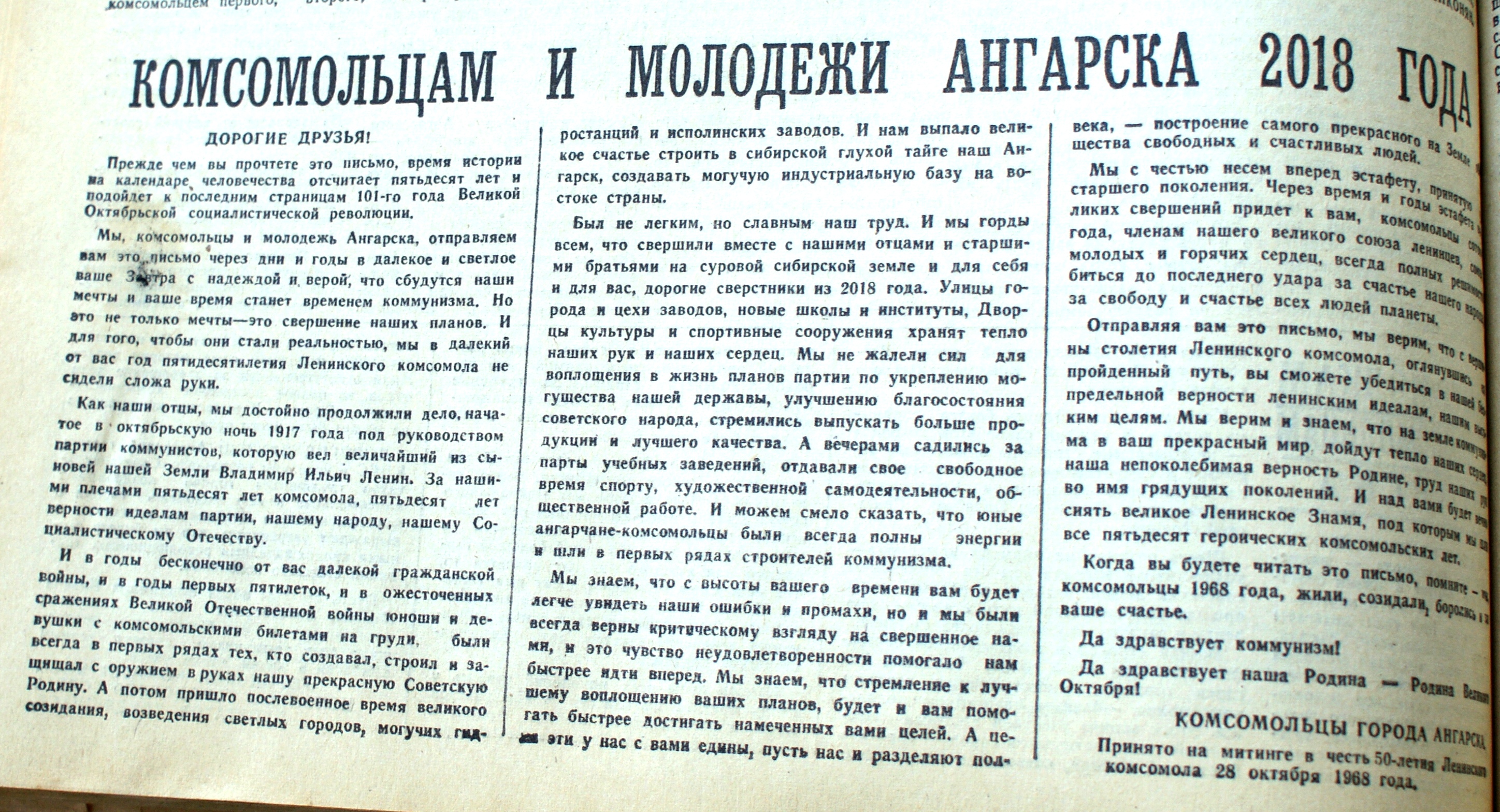 Текст обращения комсомольцев 1968 года к молодёжи 2018 г.