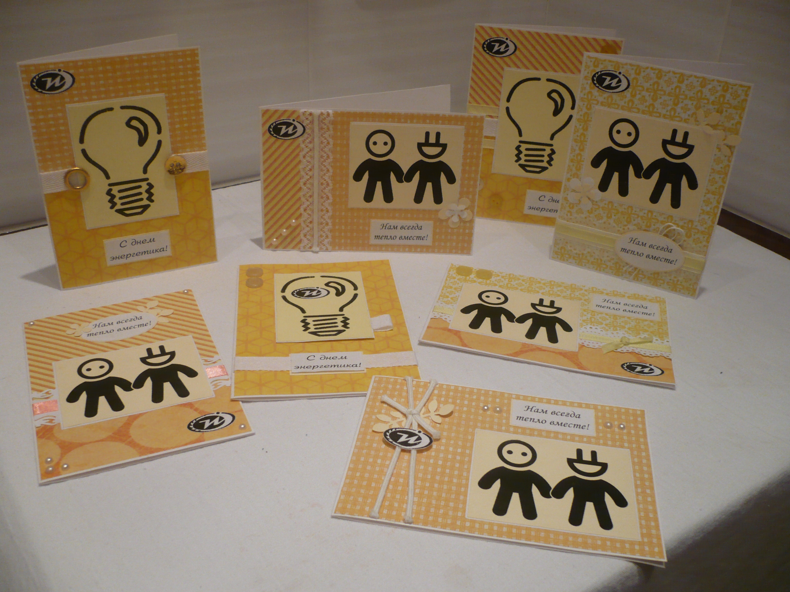 Серия открыток (8 шт.) ко Дню энергетика. Сделаны на заказ. "Коллективное" фото. Они все выполнены в одной цветовой гамме, но детали и оформление разные. С человечками (если кто не понял - это вилка в розеткой