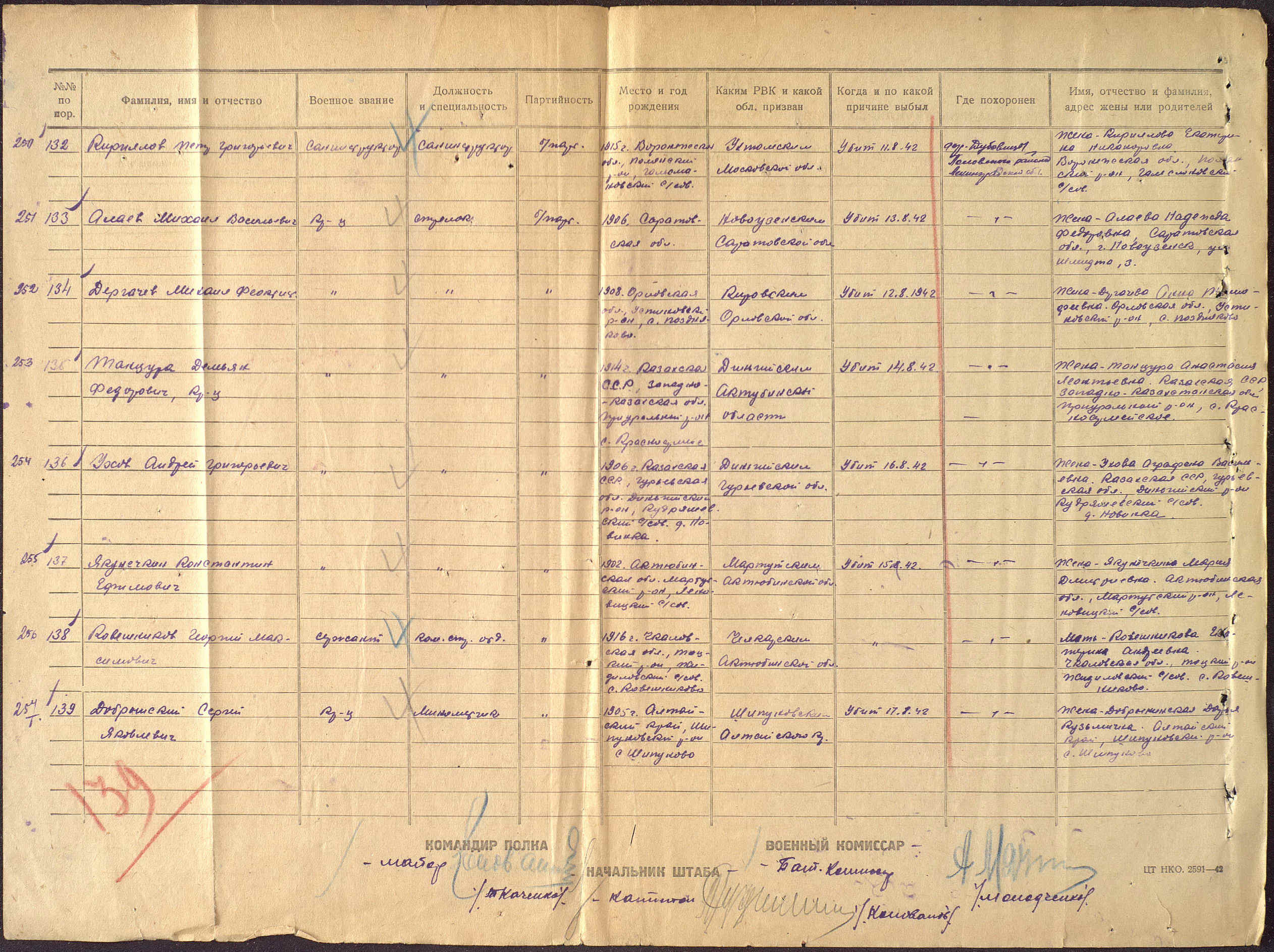подлинник сводной ведомости потерь стрелкового полка с фамилией моего деда. Северо-Западный фронт, август 1942
