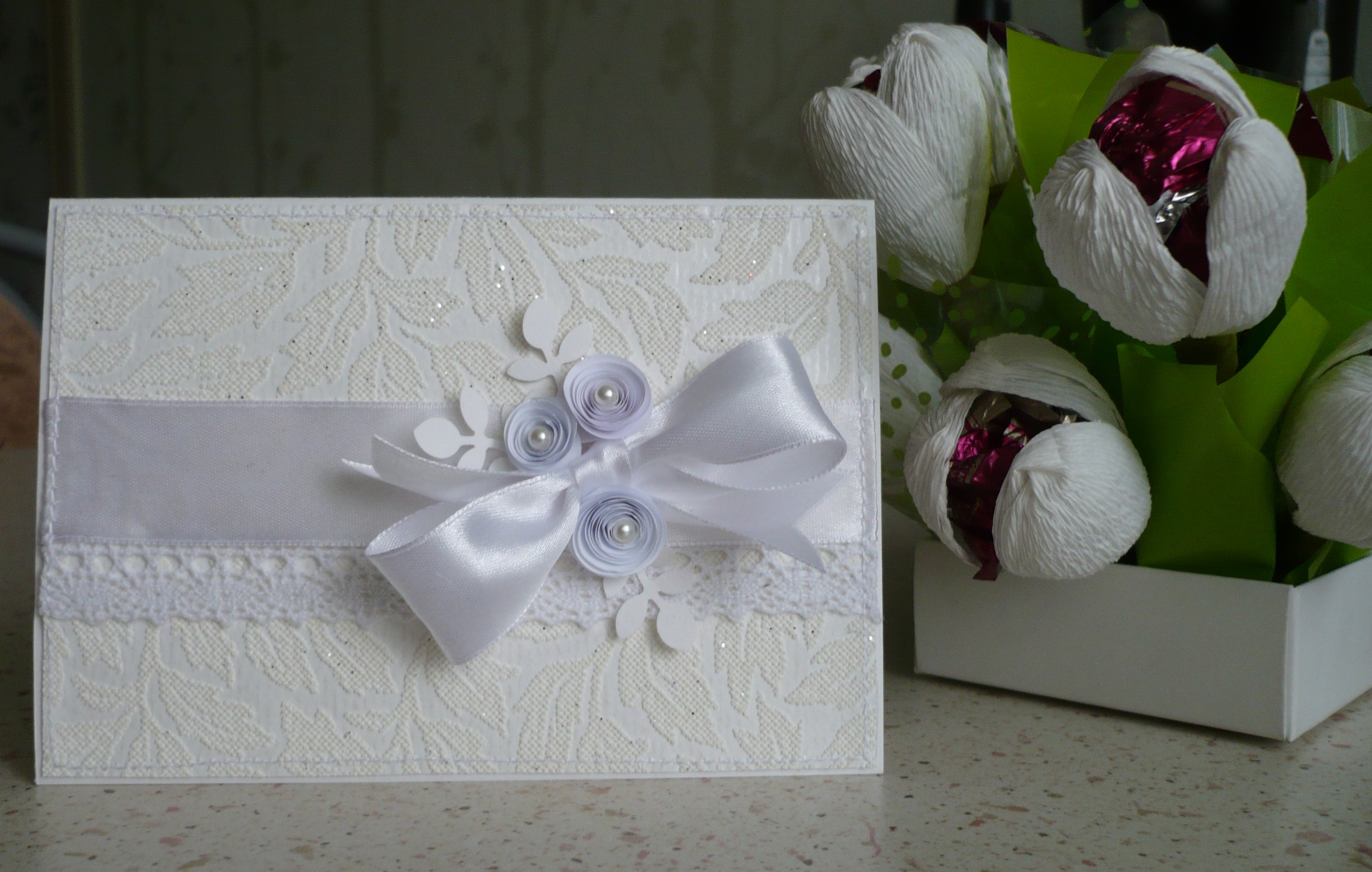 Образец приглашения на свадьбу. Размер 10х14,5 см. По желанию заказчика может быть сделана любая надпись: "Приглашение", дата свадьбы, имена жениха и невесты, т.д. Цветовая гамма может быть выбрана заказчиком. Цена одного приглашения 40 руб.