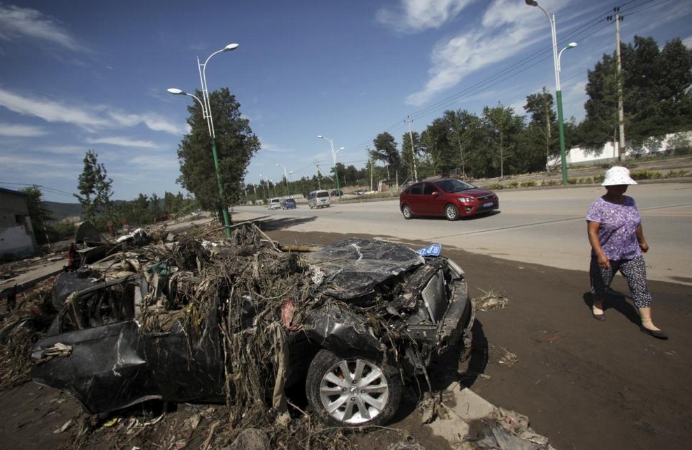 Женщина проходит мимо искореженного автомобиля, Пекин, Китай, 22 июля 2012 года