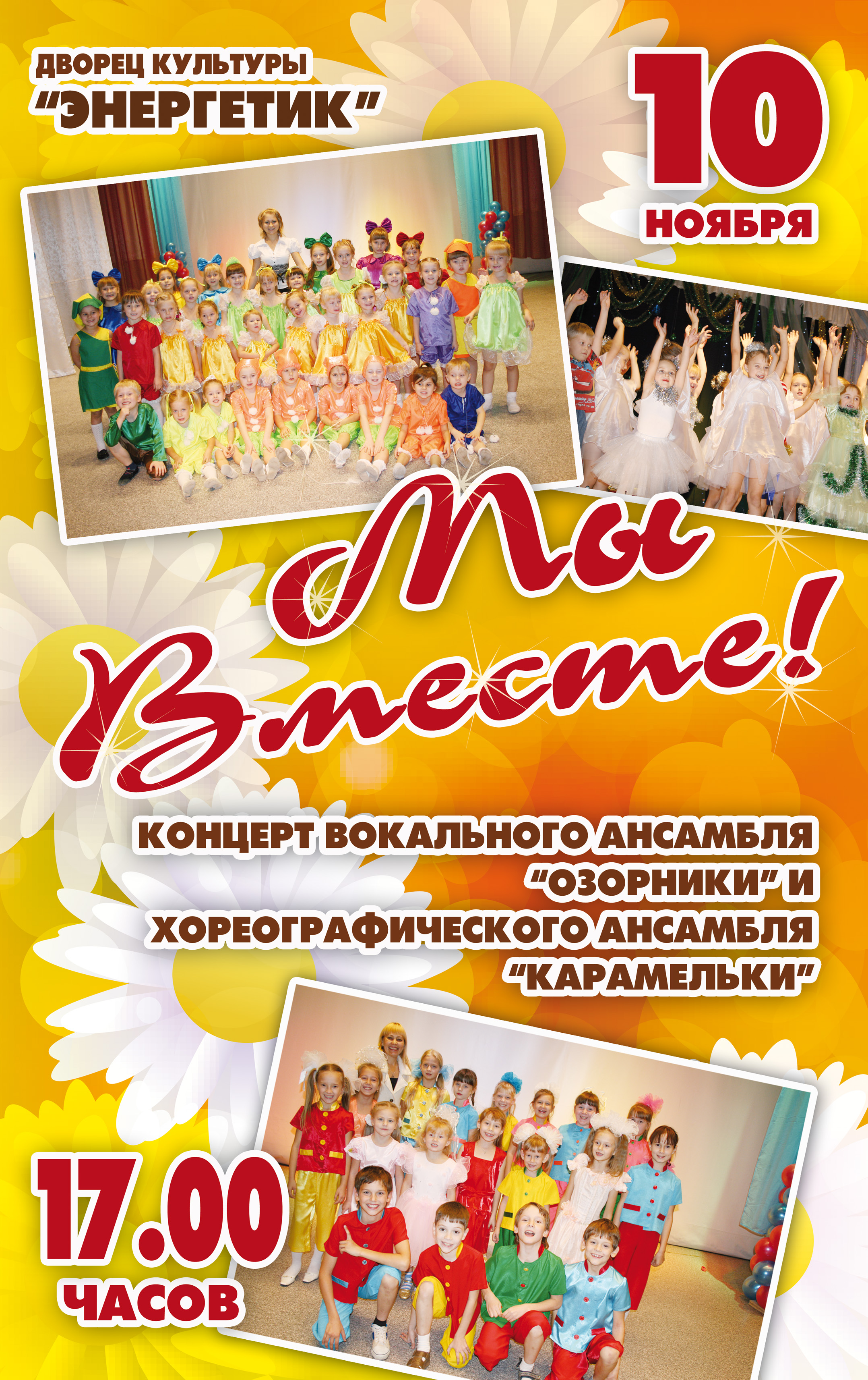 10 ноября в 17-00 час. состоится концерт детского вокального ансамбля "Озорники", руководитель Ирина Ерохина, и детского хореографического ансамбля "Карамельки", руководитель Светлана Беляевская, - "Мы вместе!". Цена билета 100 рублей. Билеты в кассе ДК. Тел. 52-25-90