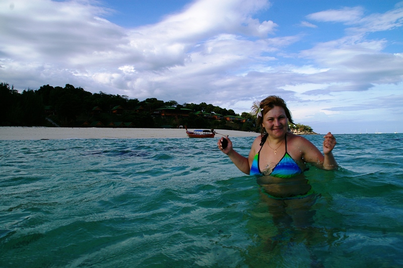 это пролив между двумя островами, и посредине песчаная коса. Хотели дойти до косы - казалось, что близко, шли-шли, а она не приближается. И вспомнили, что скоро прилив начнется, ну сами то доплывем, а фотик как? Вот сфоткались и пошли обратно. Метров 200 до берега. А в пик прилива тут метра 4-5 глубины.