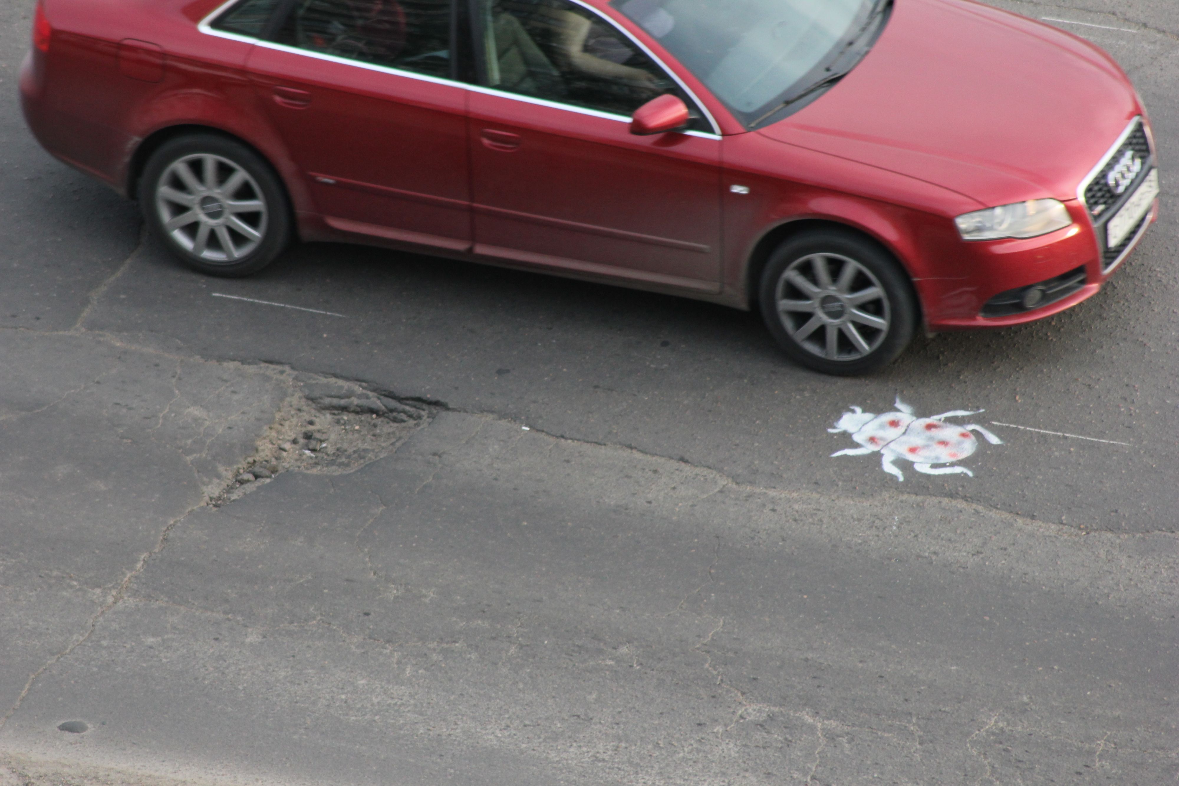 надо не жуков рисовать а лица чиновников,и посмотреть что быстрее сделают,ямы закатают или рисунки закрасят!