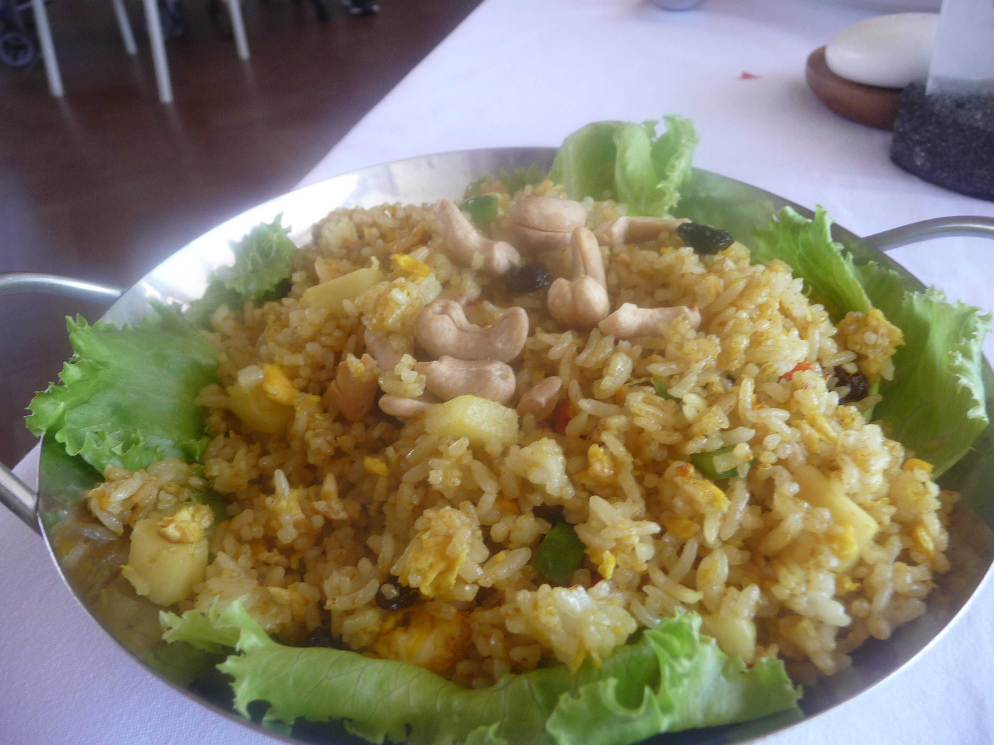 это рис,с курицей,ананасами,креветками,яйцом,изюмом и орешками кешью объедение