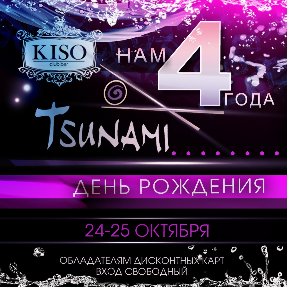 Итак, свой День рождения 24-25 октября TSUNAMI празднует в club-bar KISO! Телефон для бронирования столиков 8(3955) 686848.