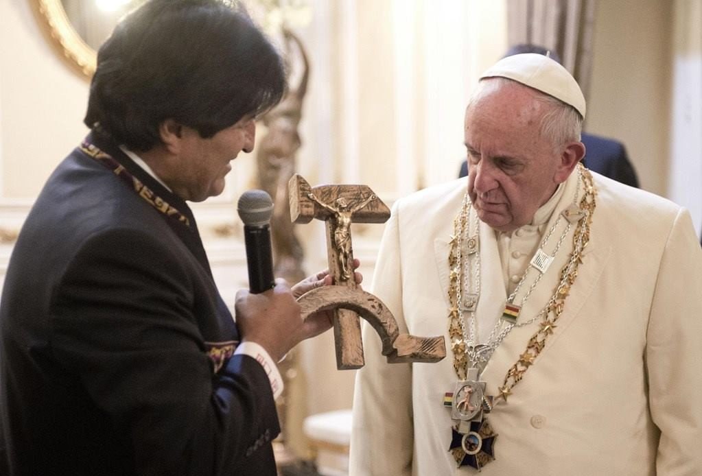 Президент Боливии Эво Моралес,подарил Папе Римскому Франциску деревянное распятие в виде серпа и молота.