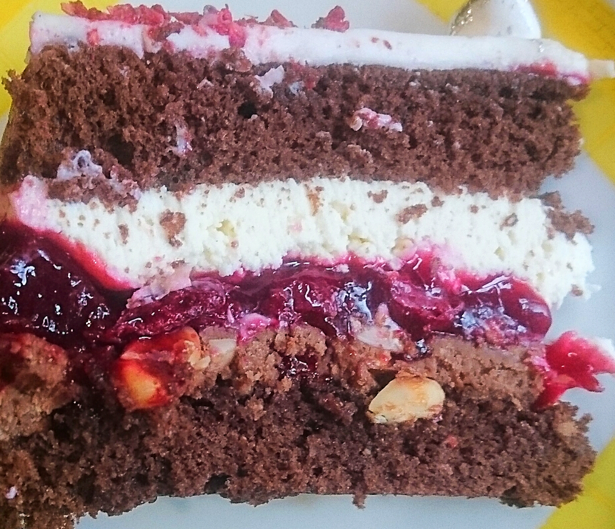 Сливочно-сырный крем, хрустящий слой с миндалем, вишневое конфи, шоколадный бисквит, крем сливочно-шоколадный