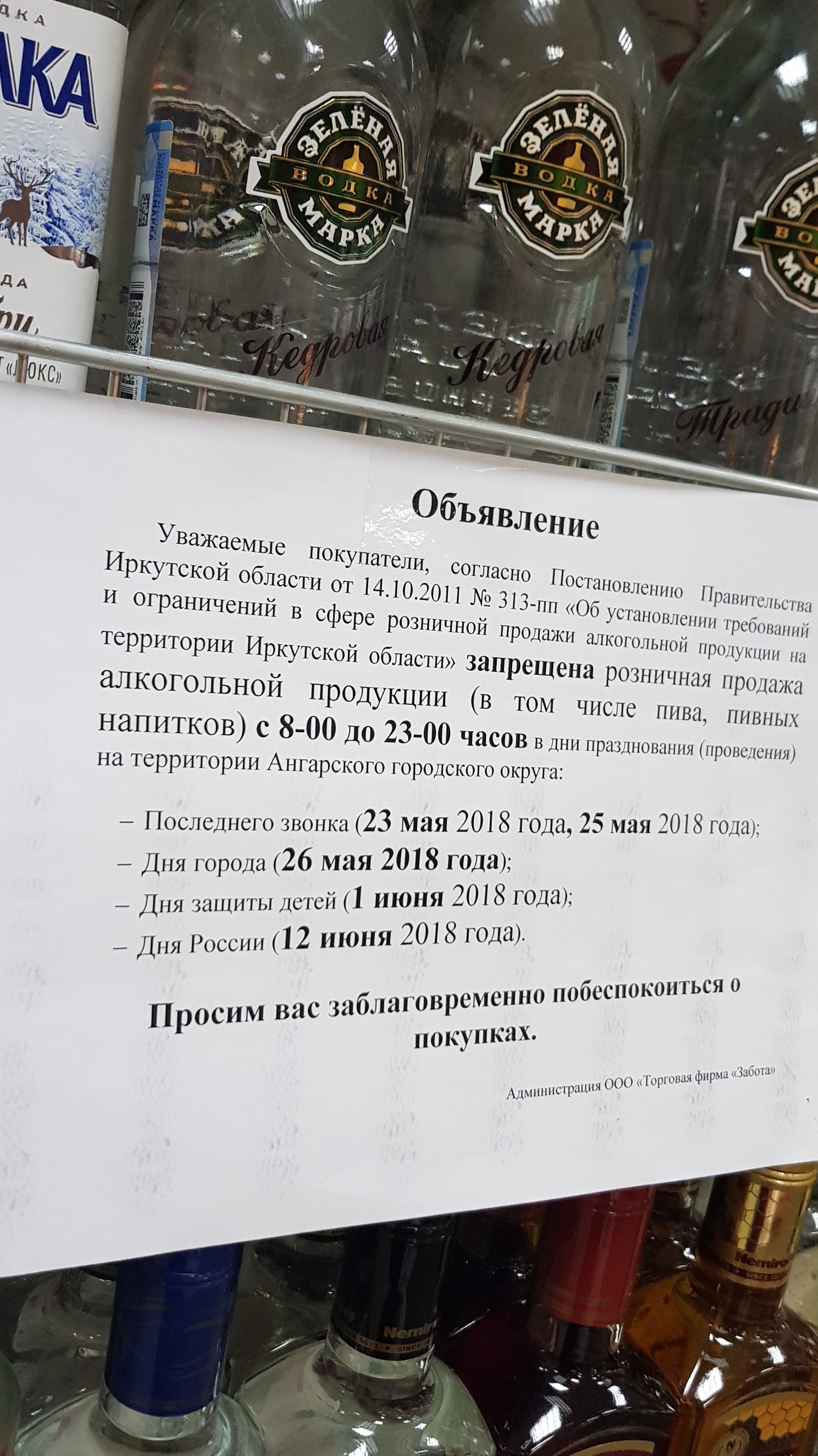 взгляните на подпись в алкообъявлении - торговая фирма "Забота". Оне заботятся о нас весь день, до 23 часов.