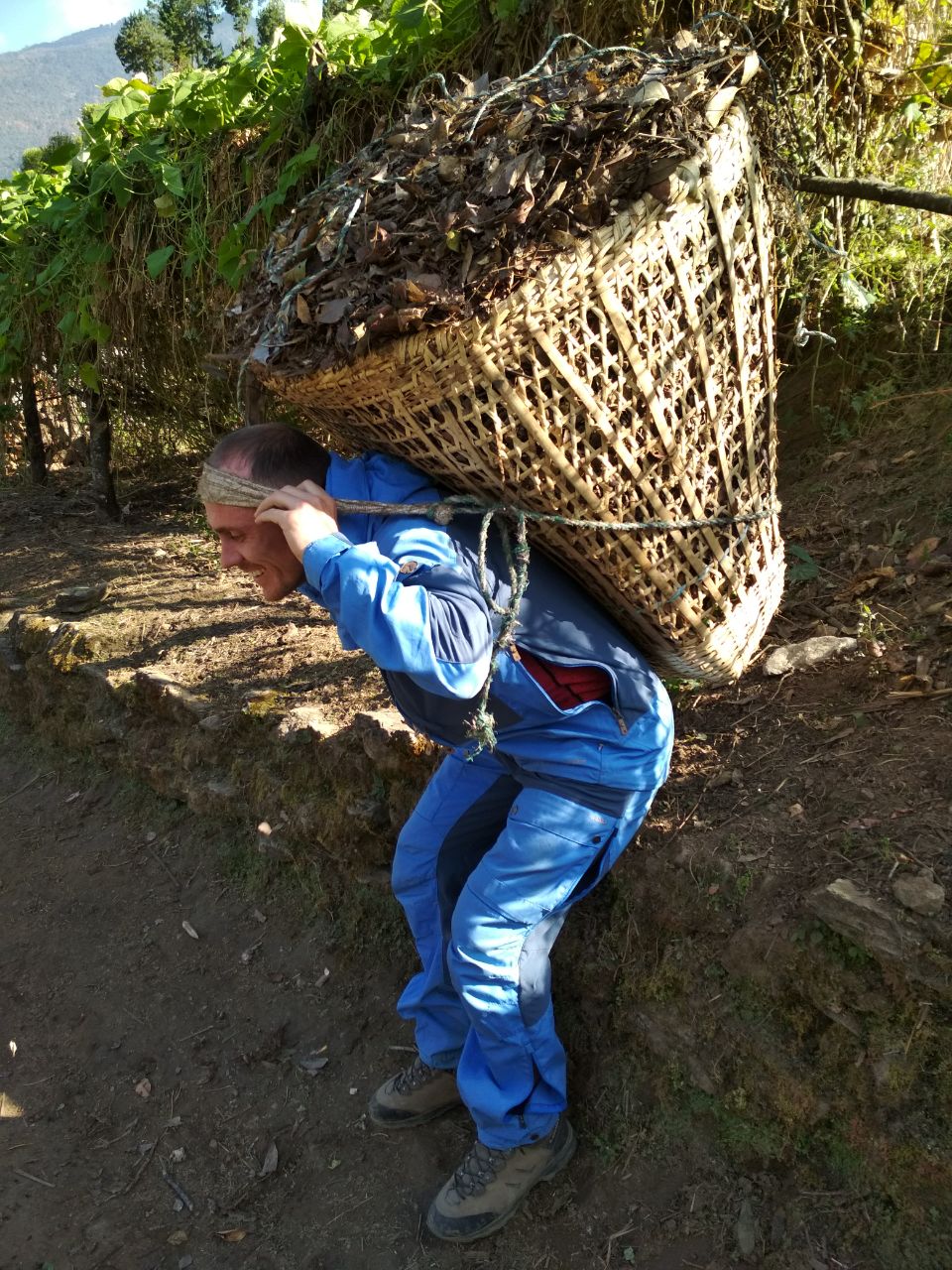 Вот такие корзинки местные жители носят на голове. Набрасывают простую петлю из веревки на корзинки, а широкую часть, из мешковины - на голову. И вперёд! С таким корзинками они туристов обгоняют только в путь! Ещё и в сланцах зачастую.