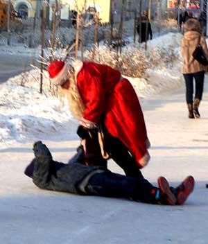 Добрый Дедушка Мороз с улыбкой на лице раздавал листовки на улице Карла Маркса. Мимо него проходил очередной местный житель и от листовки отказался. Дед Мороз вскипел и на глазах всего народа начал жестоко избивать прохожего. Люди были в полном оцепенении. Одна женщина кричала, что сейчас вызовет милицию. Останавливались проезжавшие мимо машины. Водители материли Мороза-беспредельщика. В общем, постановщик (он же исполнил роль прохожего. — Авт.) добился своего: народ зацепило!