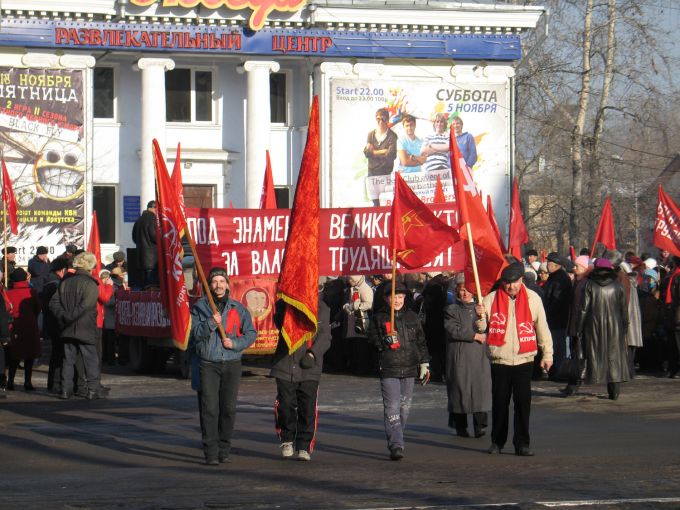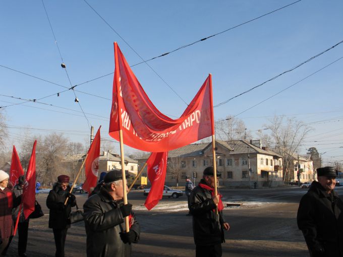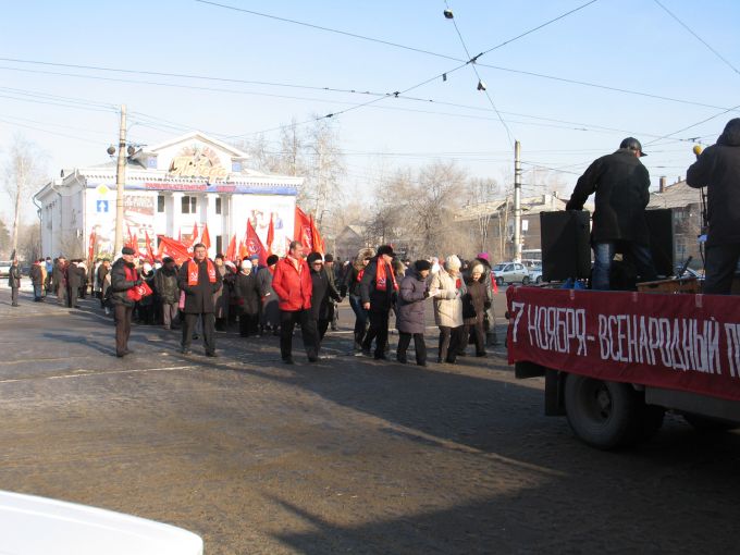 В этом, наверное, и состоит ирония нашего времени - встречать годовщину Октябрьской революции под охраной полиции. Понедельник, 12 часов дня. Традиционный сбор у "Победы", неторопливое шествие к центральной площади города. Участников, кажется, меньше, чем в прошлом году, что неудивительно - рабочий день. Много транспарантов красного цвета, много лозунгов из громкоговорителя.
