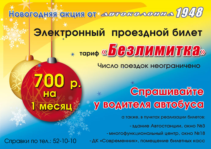 Тысячи ангарчан уже оценили преимущества использования электронных проездных билетов в автобусах «Автоколонны 1948» при поездках по городу. Накануне Нового года «Автоколонна 1948» проводит праздничную акцию и предлагает пассажирам два новых вида электронных проездных билетов. Билеты с тарифом «Безлимитный» или «70 на 60» в рамках акции можно приобрести у водителей автобусов «Автоколонны 1948» по номинальной цене. При приобретении проездных билетов у водителя стоимость самой электронной карты не оплачивается. Оба билета действительны во всех автобусах ОАО «Автоколонна 1948», отмеченных логотипом «Действует электронная система оплаты».