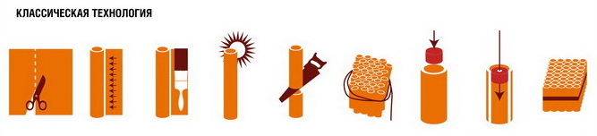Классическая технология изготовления батарей салютов предполагает множество подготовительных операций: нарезка бумаги, катка и сушка трубок, их обрезка, формирование из трубок батарей салютов, забивка дна трубок глиняными пробками и т.д. На это уходит масса времени и людских ресурсов: прежде чем батарея салютов станет начиняться пиротехническими элементами пройдет не одна неделя.