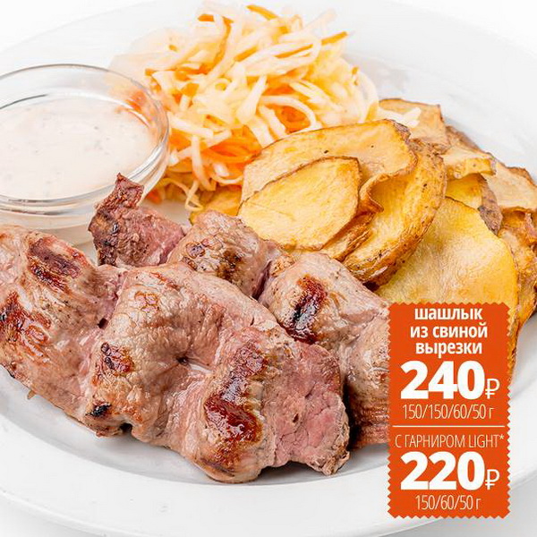 Кальмар или свиная вырезка? Шашлык из кальмара – это порция чистого белка, обогащенного витаминами B, C, E, Омега 3- и жирными кислотами. Секрет вашей стройной фигуры с неповторимым деликатным вкусом. В сочетании «вкус/польза» с головоногим морепродуктом уверенно конкурирует только шашлык из свиной вырезки, невероятно богатой гемоглобином. Рядом с восхитительно приготовленным мясом красуется буква L, первая в слове LIGHT (легкий) и означающая, что к нежирной сочной вырезке вы можете вместо гарнира взять овощной салатик.