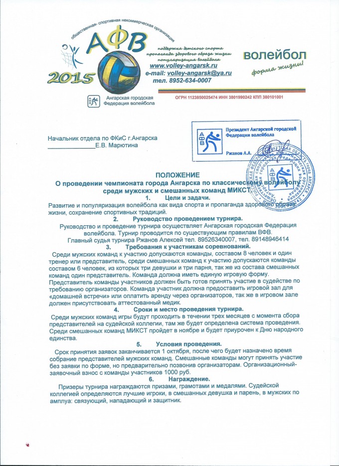 Положение чемпинат города Ангарска по волейболу: Здравствуйте! Отдел по Физической культуре и спорту г.Ангарска совместно с Ангарской городской Федерацией волейбола приглашает к участию в чемпионате города по классическому волейболу среди мужских и смешанных команд организации, трудовые коллективы, спортивные школы и добровольные объединения. Для участия необходимо подать заявку в свободной форме до 1 октября на ящик: volley-angarsk@ya.ru Или сообщить по тел. 89526340007, 89148946414 (Алексей Александрович) Условия участия прописаны в положении: 1. Мужская команда 8 человек и один тренер или представитель, заявка участников (заявленные участники в этом чемпионате не имеют право выступать за другую команду, коллектив), организационный- заявочный взнос 1 т.р. с команды Игры пройдут согласно расписания в течении трех месяцев. 2. Смешанная команда 6 человек (три девушки и три парня), заявка участников (заявленные участники в этом чемпионате не имеют право выступать за другую команду, коллектив), организационный- заявочный взнос 1 т.р. с команды. Игры пройдут в виде блиц-турнира в праздничный день к Дню народного единства в ноябре. Собрание представителей и судейской коллегии состоится 2 октября в 18.00 в зале Ермак, учебная часть.