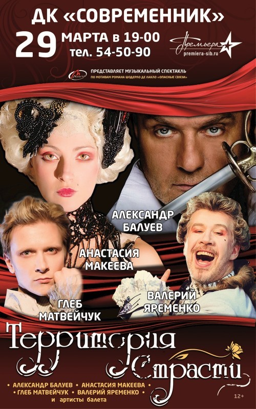 29 марта ДК Современник представляет музыкально – драматический спектакль "Территория страсти" (по мотивам романа в письмах Шадерло де Лакло «Опасные связи»). Режиссер и продюсер: Александр Балуев. Композитор: Глеб Матвейчук.