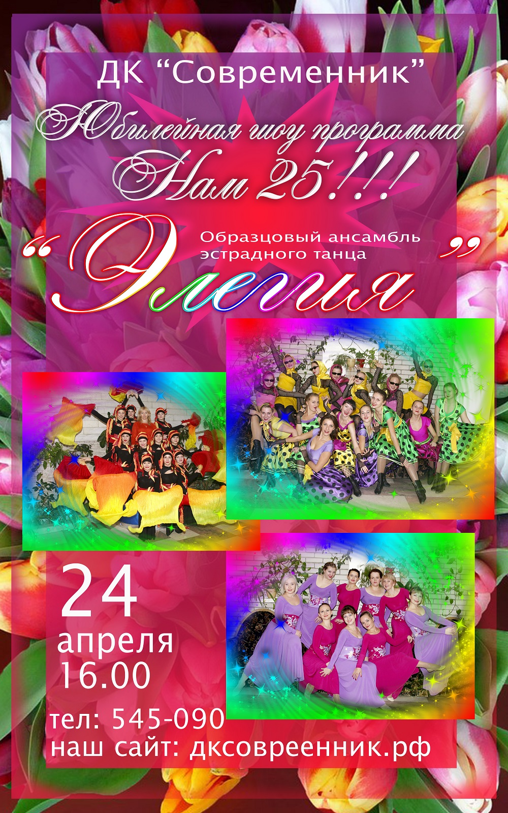 Образцовый ансамбль эстрадного танца "Элегия" отмечает 25-летний юбилей! 24 апреля, в 16:00, на сцене ДК "Современник" - юбилейная шоу-программа "Нам 25!". Не пропустите!