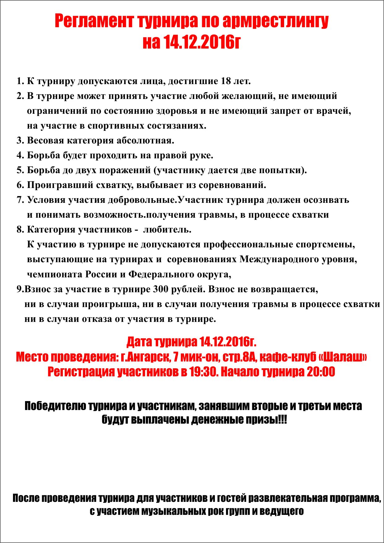 14 декабря в кафе-клубе "Шалаш" (7 м-он, стр. 8а) пройдет турнир по армрестлингу для любителей. Регистрация участников начнется в 19:30, начало турнира - в 20:00.