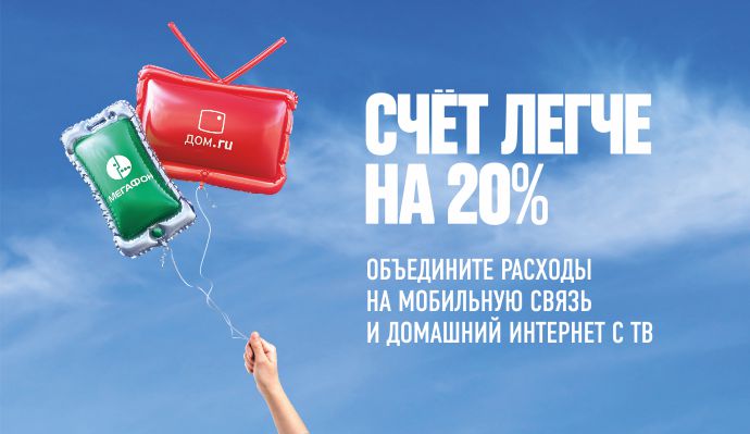 В рамках нового проекта пользователь получит постоянную скидку в размере 20% на услуги «МегаФона» и еще 20% - на интернет и цифровое ТВ в пакетном предложении от «Дом.ru». При подключении моноинтернета скидка составит 10%. Акция распространяется на один договор с «Дом.ru» и до трех номеров, зарегистрированных на одного абонента "Мегафона".