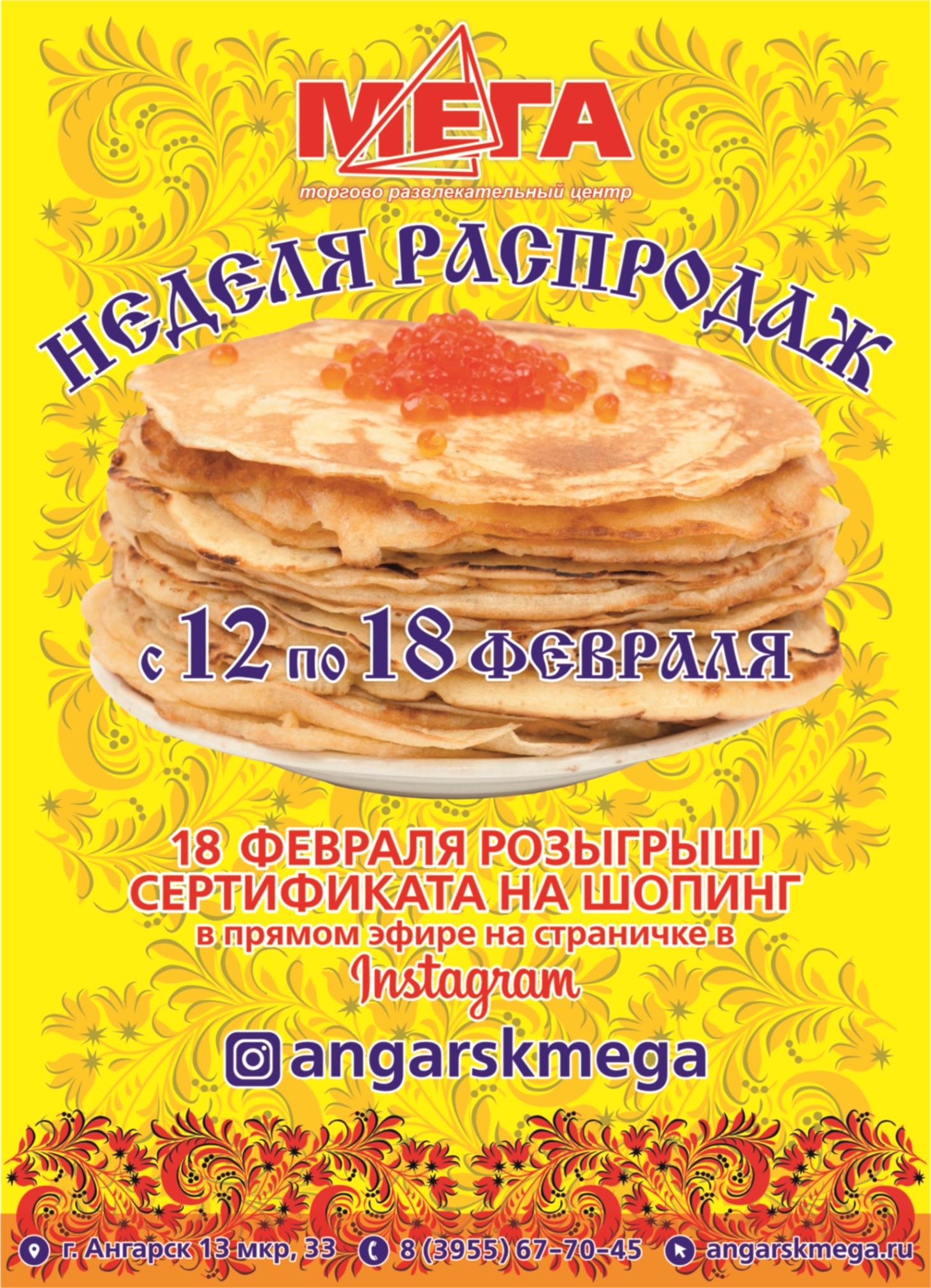 В ТРЦ "Мега" с 12 по 18 февраля пройдет неделя распродаж! Самое время порадовать себя в праздничную масленичную неделю! Совершайте покупки на сумму от 1500 рублей и получайте купоны на стойке Администратора, а 18 февраля в 16:30 веселый Скоморох проведет розыгрыш сертификата на шопинг в торговом центре в прямом эфире на страничке инстаграм @angarskmega.