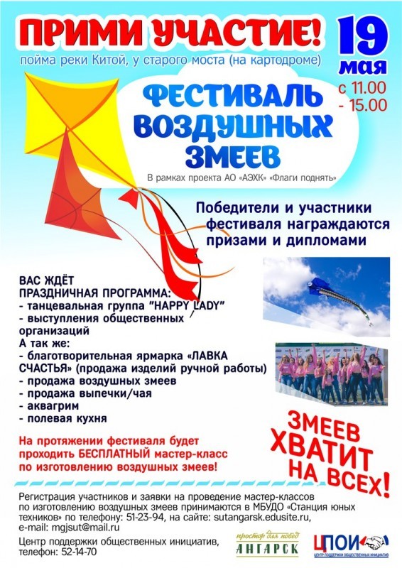 19 мая в Ангарске состоится ежегодный фестиваль воздушных змеев! Место проведения: пойма реки Китой, у старого моста (на картодроме). Время - с 11:00 до 15:00. Принять участие могут все желающие - и взрослые, и дети.