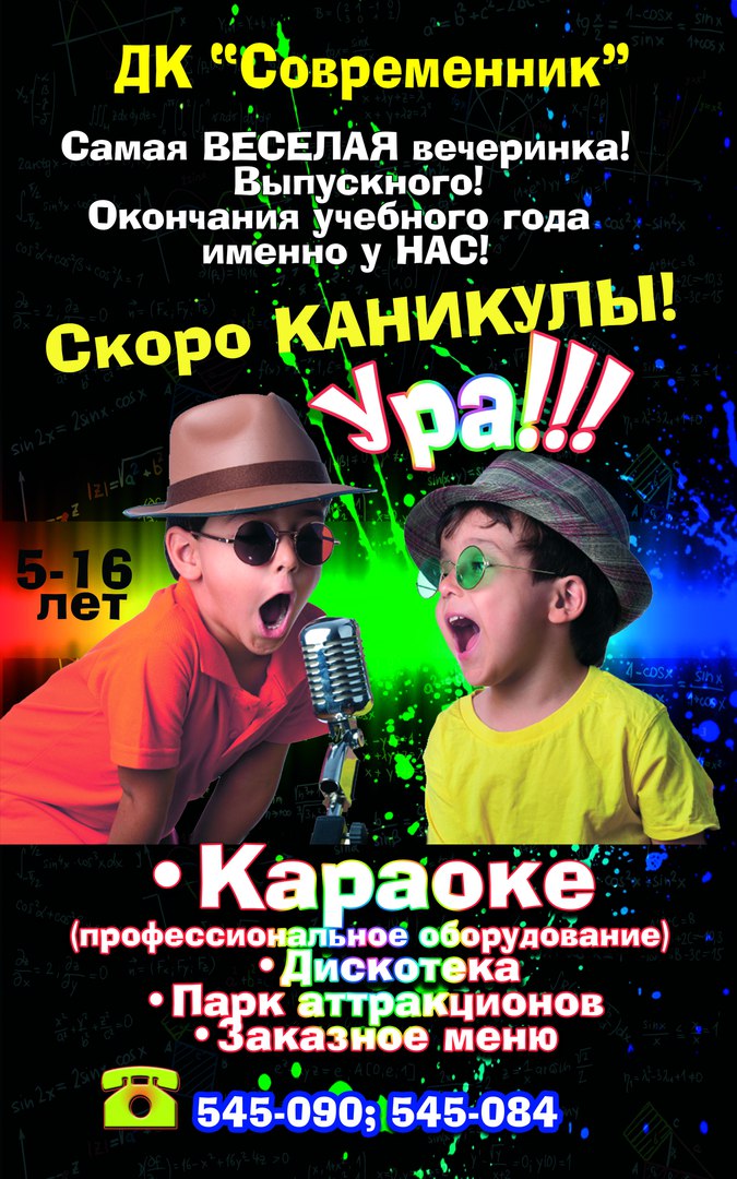 Где отметить окончание учебного года или школьный выпускной? Конечно в ДК "Современник"! Караоке, дискотека, парк аттракционов, отличное меню - всё, что нужно для грандиозного детского праздника!