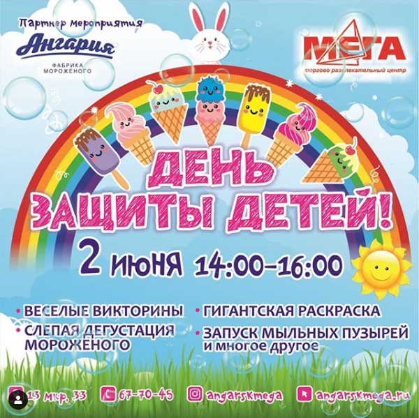 2 июня с 14.00 до 16.00 ТРЦ "Мега" празднует с вами День защиты детей! Яркая программа со сладкими клоунессами, гигантским твистом, запуском мыльных пузырей, аквагримом, викториной, конкурсами и другим весельем ожидает всех гостей праздника! Веселый Зайчик будет делать со всеми гостями красивые фотографии и танцевать флешмобы.