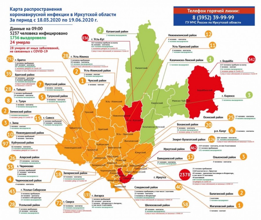 Количество подтвержденных случаев коронавируса в Иркутской области выросло до 5237. Прирост за сутки составил 193 человека, сообщает оперативный штаб региона. Вирус распространяется среди местного населения.