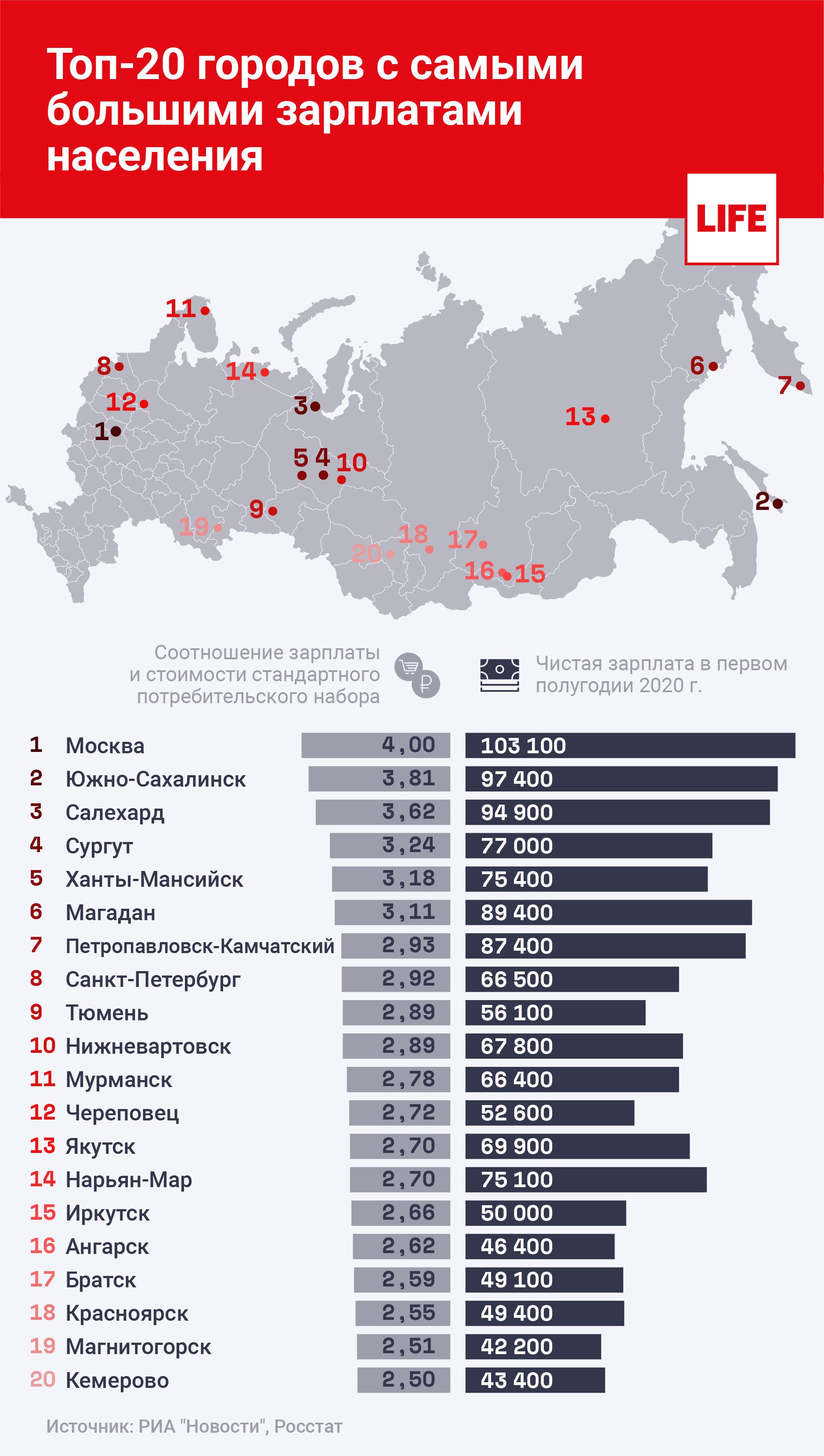 Средние зарплаты по городам (за вычетом НДФЛ) рассчитаны на основе муниципальной статистики за январь–июнь 2020 года по крупным и средним предприятиям