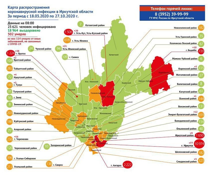 223 новых случая заражения коронавирусом подтверждено в Иркутской области, из них 77 — в Иркутске. По данным оперштаба на 27 октября, общее число инфицированных в регионе составляет 23 621 человек (в Иркутске — 10 974, Ангарске — 2222, Иркутском районе — 1650 (+9), Усть-Куте — 1506 (+20), Братске — 1224 (+38).