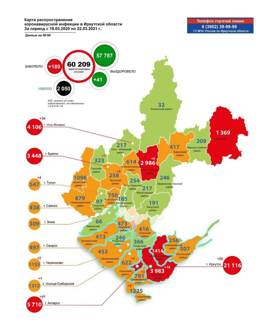 По информации оперативного штаба, 22 марта в Иркутской области выявили еще 180 случаев заражения коронавирусной инфекцией. Общее число инфицированных составило 60 209 человек.