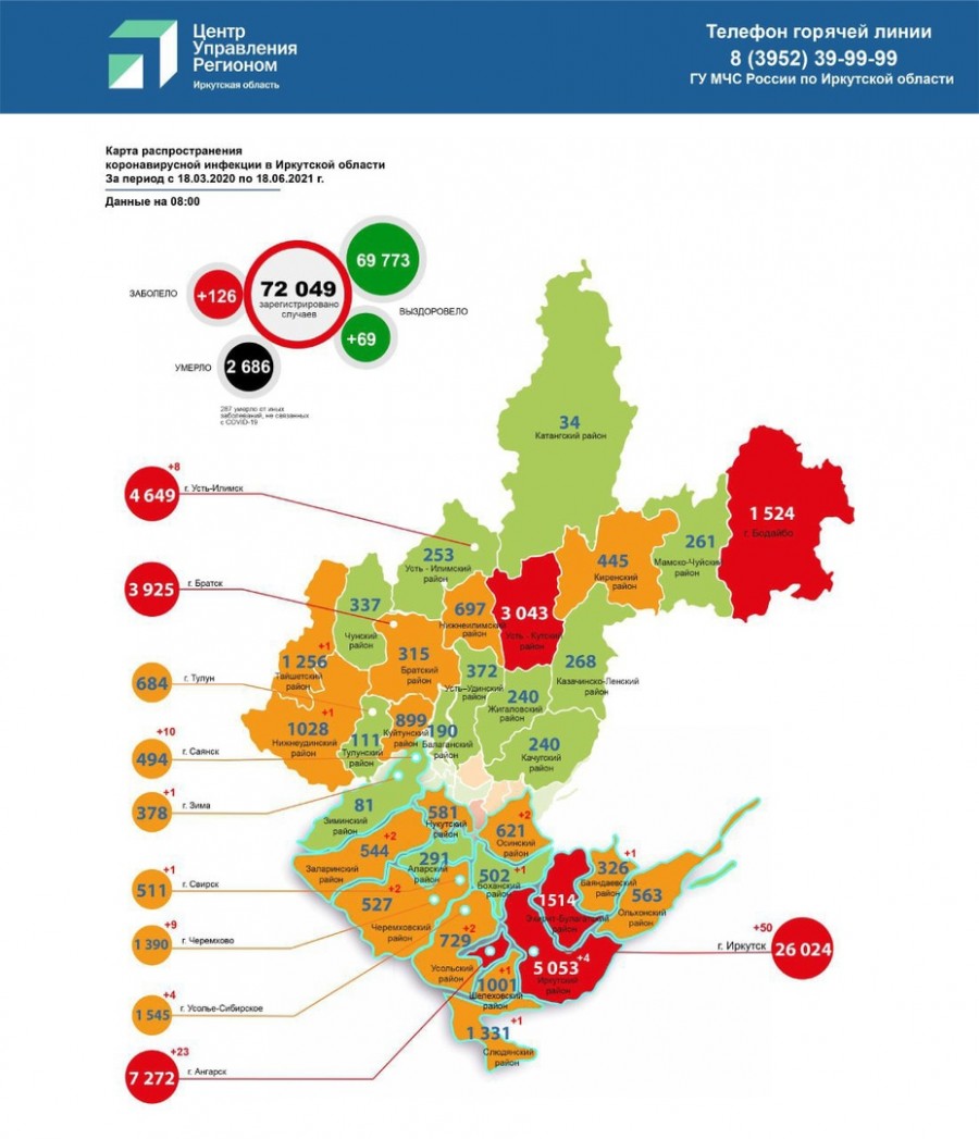По данным оперативного штаба на 18 июня, в Иркутской области число зараженных коронавирусом составило 72 049. За сутки заразились 126 жителей региона.