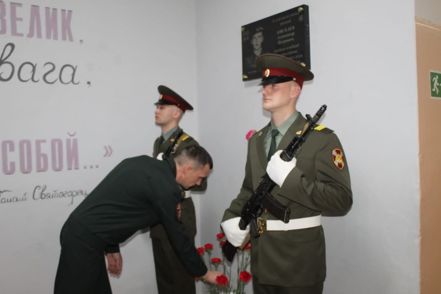 На открытии памятного знака присутствовали офицеры полка по охране важного государственного объекта Росгвардии, ветераны, администрация школы, представители городской администрации и школьники. Но самым почетным участником мероприятия стала мама погибшего военнослужащего Любовь Михайловна Кисилева.