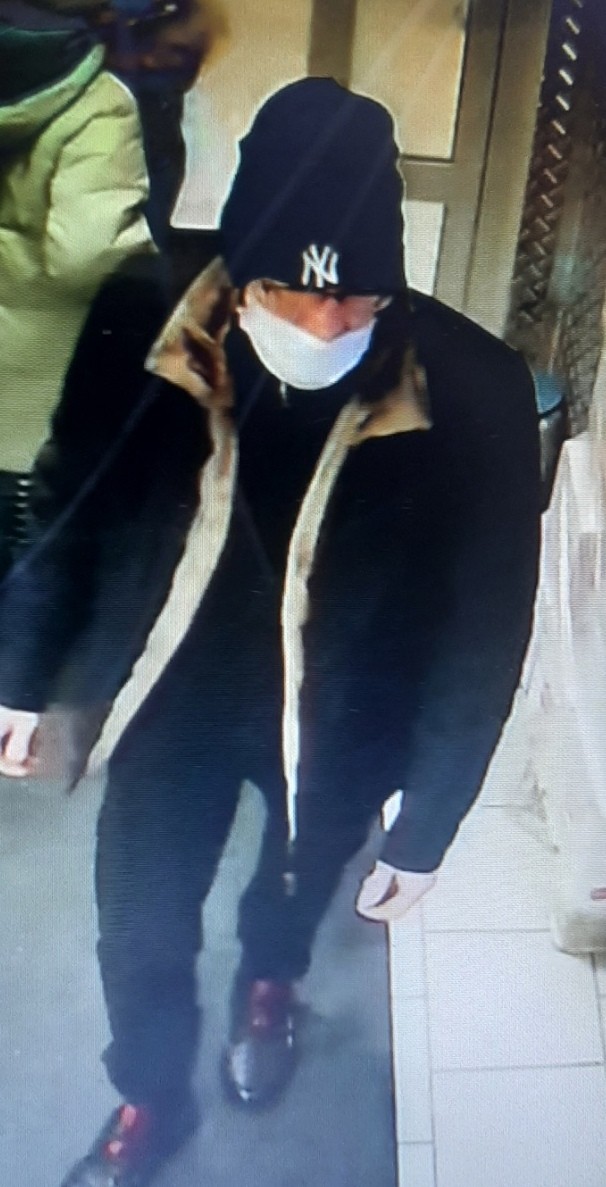 Приметы: мужчина, на вид 40-45 лет, рост около 170 см, худощавого телосложения, европейский тип лица, носит очки . Одета: черная шапка с белой эмблемой спереди, черная укороченная дубленка, черные штаны, кроссовки с красными шнурками.