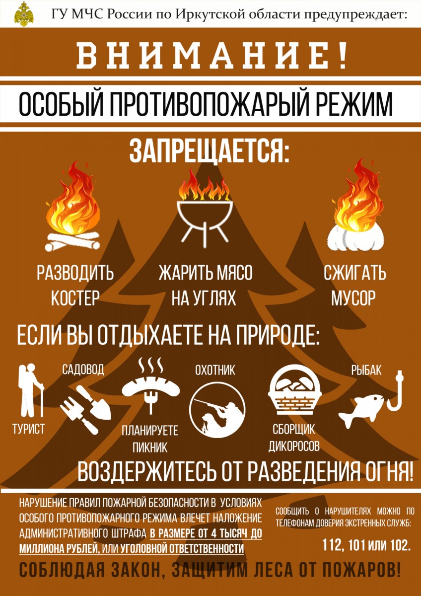 В связи с наступлением периода особой пожарной опасности, связанной с прогнозом неблагоприятных метеорологических явлений и возникающей угрозой населенным пунктам и объектам экономики, для обеспечения безопасности жизнедеятельности населения Иркутской области с 8 часов 30 апреля до 8 часов 15 июня 2022 года вводится особый противопожарный режим на территории Аларского, Балаганского, Баяндаевского, Боханского, Заларинского, Зиминского, Иркутского, Качугского, Куйтунского, Нижнеудинского, Нукутского, Ольхонского, Осинского, Слюдянского, Тулунского, Усольского, Усть-Удинского, Черемховского, Чунского, Шелеховского, Эхирит-Булагатского районов, городов Иркутск, Ангарск, Усолье-Сибирское, Черемхово, Свирск, Саянск, Зима, Тулун.