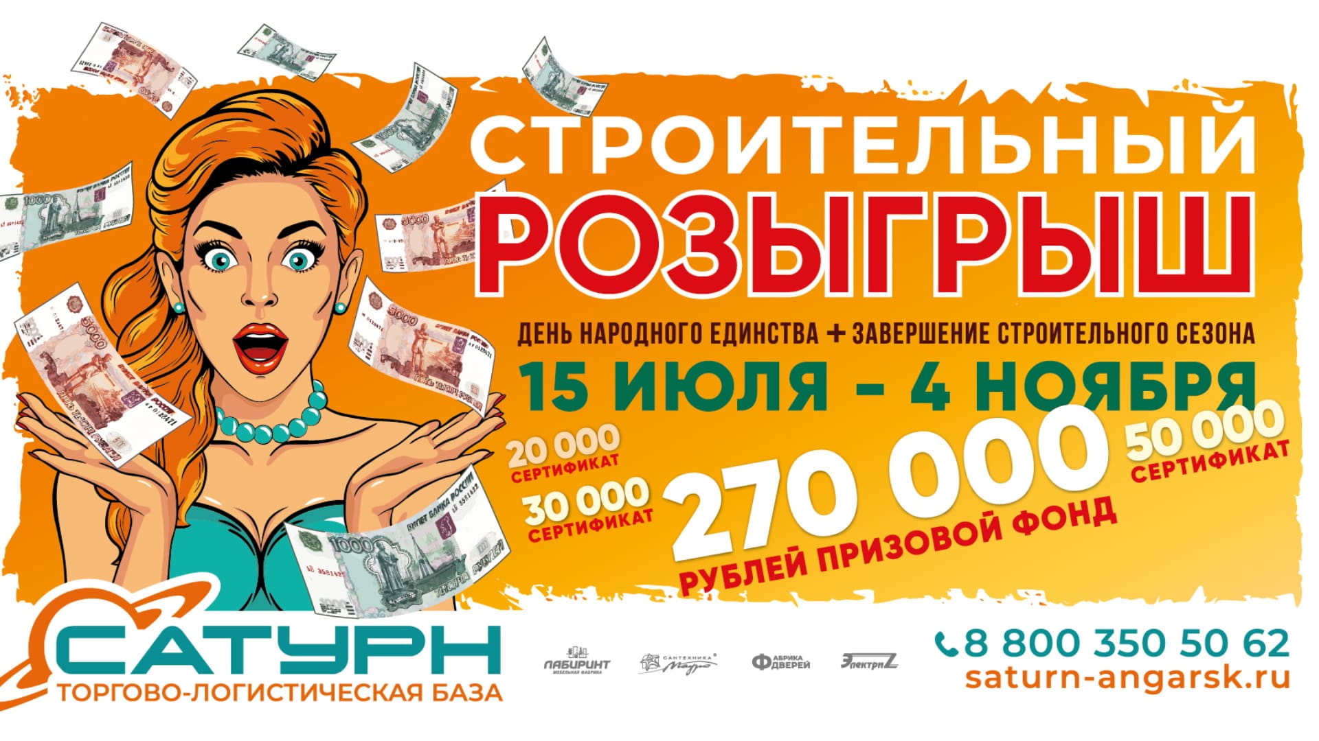 Торгово-логистическая база «Сатурн» проводит «Строительный розыгрыш» - беспроигрышную лотерею для покупателей с общим призовым фондом 270 000 рублей. Отличный подарок к окончанию строительного сезона!