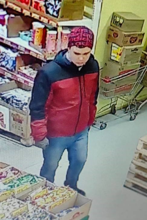 Приметы: молодой человек на вид 18-25 лет, среднего телосложения, европейский тип лица, был одет в шапку черную с красными надписями, красно-черную куртку, синие джинсы.