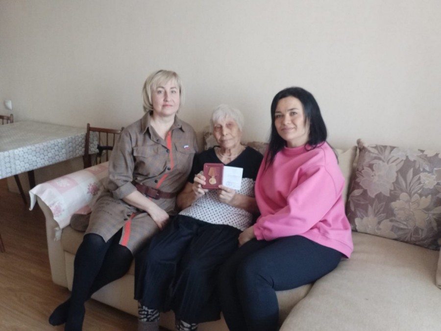 Депутат, директор школы № 37 имени Королькова А. М., Героя РФ Ольга Желтоногова и председатель Совета женщин Елена Попова вместе с учениками 11 МВД-класса вручили медаль Прасковье Алексеевне Чуриной. В военные годы она работала на тракторе, заготавливала лес. Все для фронта, все для Победы!