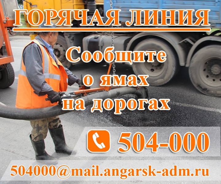 Сообщить о ямах на дорогах ангарчане могут на горячую линию по телефону 8(3955)50-40-00. Она работает в будние дни: с понедельника по четверг с 9.00 до 18.00, в пятницу с 9.00 до 17.00. Перерыв с 13.00 до 14.00.