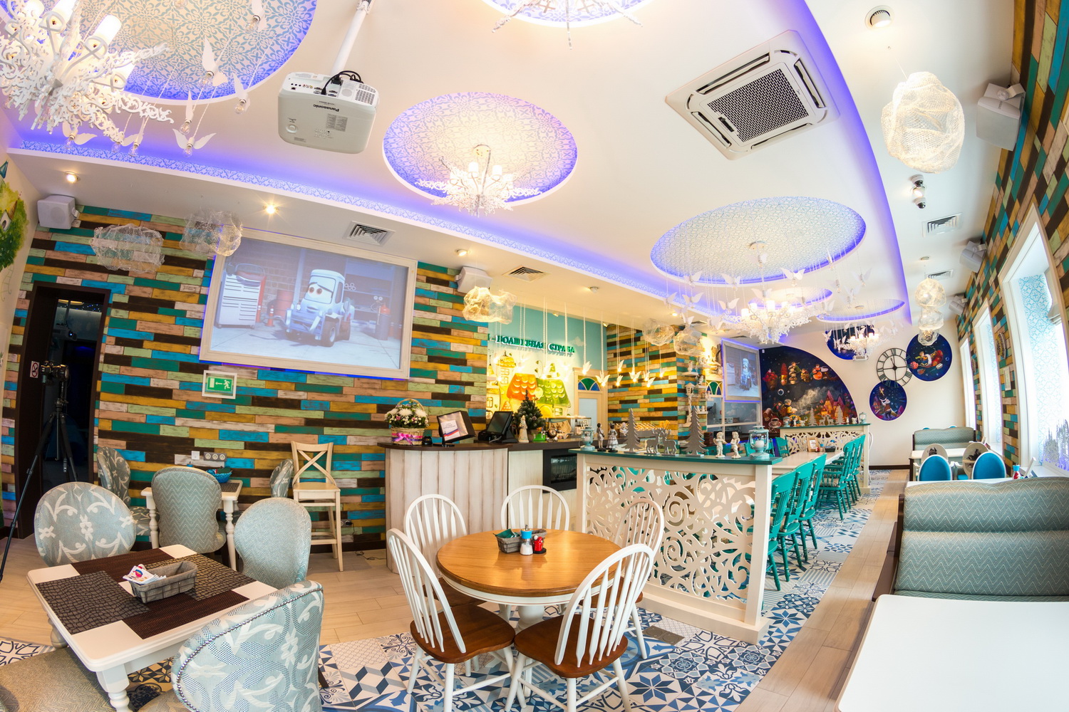 Были сегодня. Народу полное кафе. В зале два огромных телевизора, шла Рапунцель. Но лучше бы шли краткометражные, я засмотрелась, не хотелось уходить. Отделка красивая и качественная. В туалете пеленальный столик с раковиной, детский горшок, подставка для мытья рук, даже бумажные сидения на унитаз. Меню скудное. Салаты 100-180, всего 4 вида, горячее 350-450, тоже вида 4, пиццы 300-550, тоже 4 вида, есть драники, смузи, какие-то оладьи, зачем-то овсяная каша и десерты. Взяли пиццу пеперони, салат Цезарь с креветками, драники, два десерта и литр морса, отдали 1160. Предлагают ледяную комнату 50 руб. с человека. Набралась группа человек 10, всех одели в теплую одежду, завели в комнату, в ней холодно, стоит ледяной трон и дед мороз садит каждого, говорит взяться за нос и загадать желание, пробыли в ней минут 5. На выходе стоит автомат для фото, который тут же распечатывает их бесплатно, нафотались всяко разно.