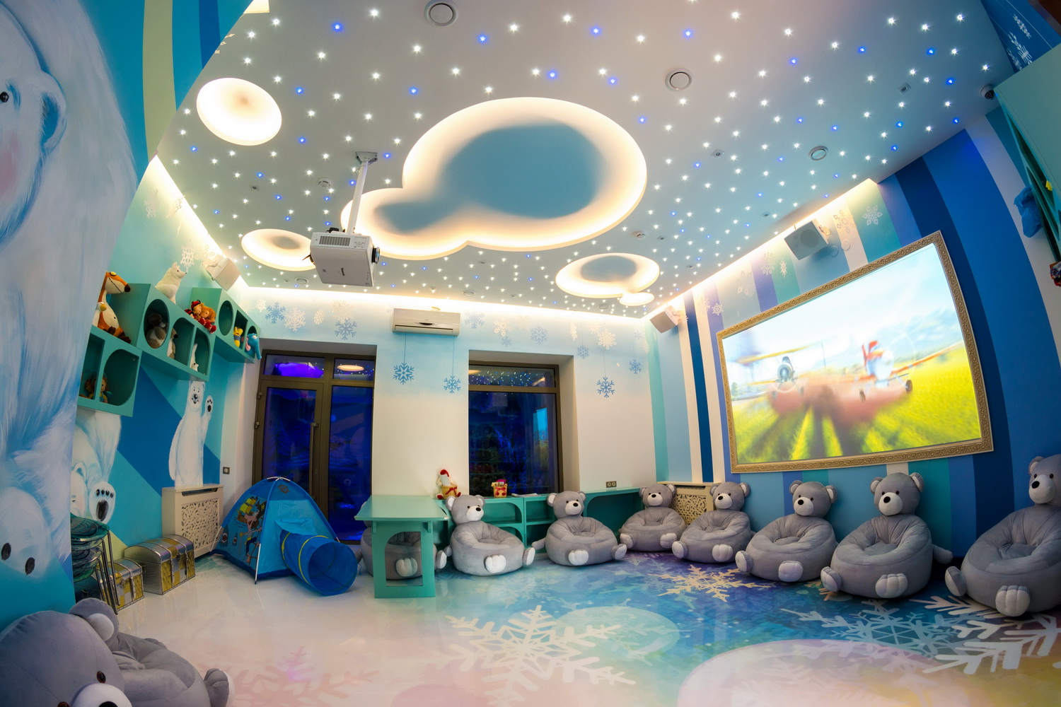 Под развлечение в ресторане отведено несколько мест. Во-первых, специальный барный стол, предназначенный для проведения с детьми «cook-up» – приготовления всевозможных блюд под руководством одного из поваров. Во-вторых, игровая комната для развивающих занятий педагогов с детьми, а также игр с аниматором. Кроме того, в комнате предусмотрен большой экран для трансляции мультфильмов и познавательных передач. В-третьих, изюминка ресторана – «ледяная» пещера, одна из резиденций Деда Мороза, в которой он иногда бывает. Детям будет интересно в нее зайти, походить, осмотреться и посидеть на настоящем ледяном троне!