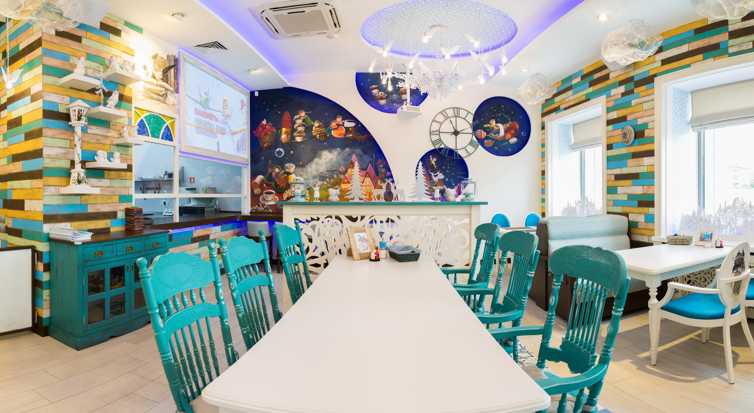 – Концепция дизайн-проекта была для нас очевидна. Детский ресторан – это прежде всего идеальное пространство для деток, мир, который подогнан именно под самых «маленьких» – сказочный, уютный, колоритный… Заложенная владельцами идея с ледяной комнатой дала нам кучу творческих возможностей. Ведь всем известно, что самый долгожданный детский праздник – Новый год! Что еще больше заставит ребенка поверить в сказку, если не посещение настоящей резиденции Деда Мороза! Волшебные ледяные скульптуры и чудное «обмундирование» – дивные муфточки и валеночки – окунут ваше чадо в настоящую ледяную сказку. А как приятно будет в канун Нового года или на собственный день рождения получить подарки от самого что ни на есть настоящего русского Деда Мороза! Чтобы не «заморозить» наших драгоценных деток, продумана еще одна анимационная комната со всеми необходимыми удобствами. Ребят здесь занимают и развивают профессиональные педагоги и аниматоры. Интерьер безупречен и комфортен для любого детского мероприятия, будь то «cook-up» или день рождения. Хочется отметить, что заведения для детей подобного уровня тяжело отыскать даже в столице. Во всем МЫ ПРОЯВЛЯЕМ трепетный и подлинно нежный подход к детям в целом. Я, в свою очередь, постаралась внести частичку своей души, собственного озорного восприятия и фантазии, чтобы интерьер был лаконичен по отношению к детской фактурности, индивидуальности и натуре. От всей души благодарю всю команду: скульпторов ледяных фигур, инсталляторов и художников. Хочется верить, что тандем местных и столичных мастеров превзойдет все ваши ожидания.