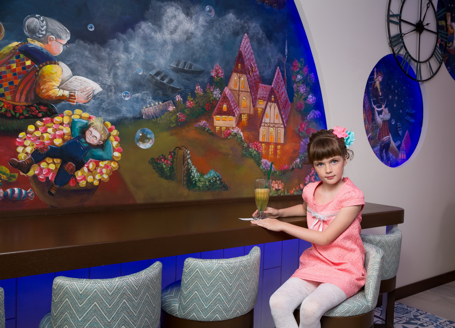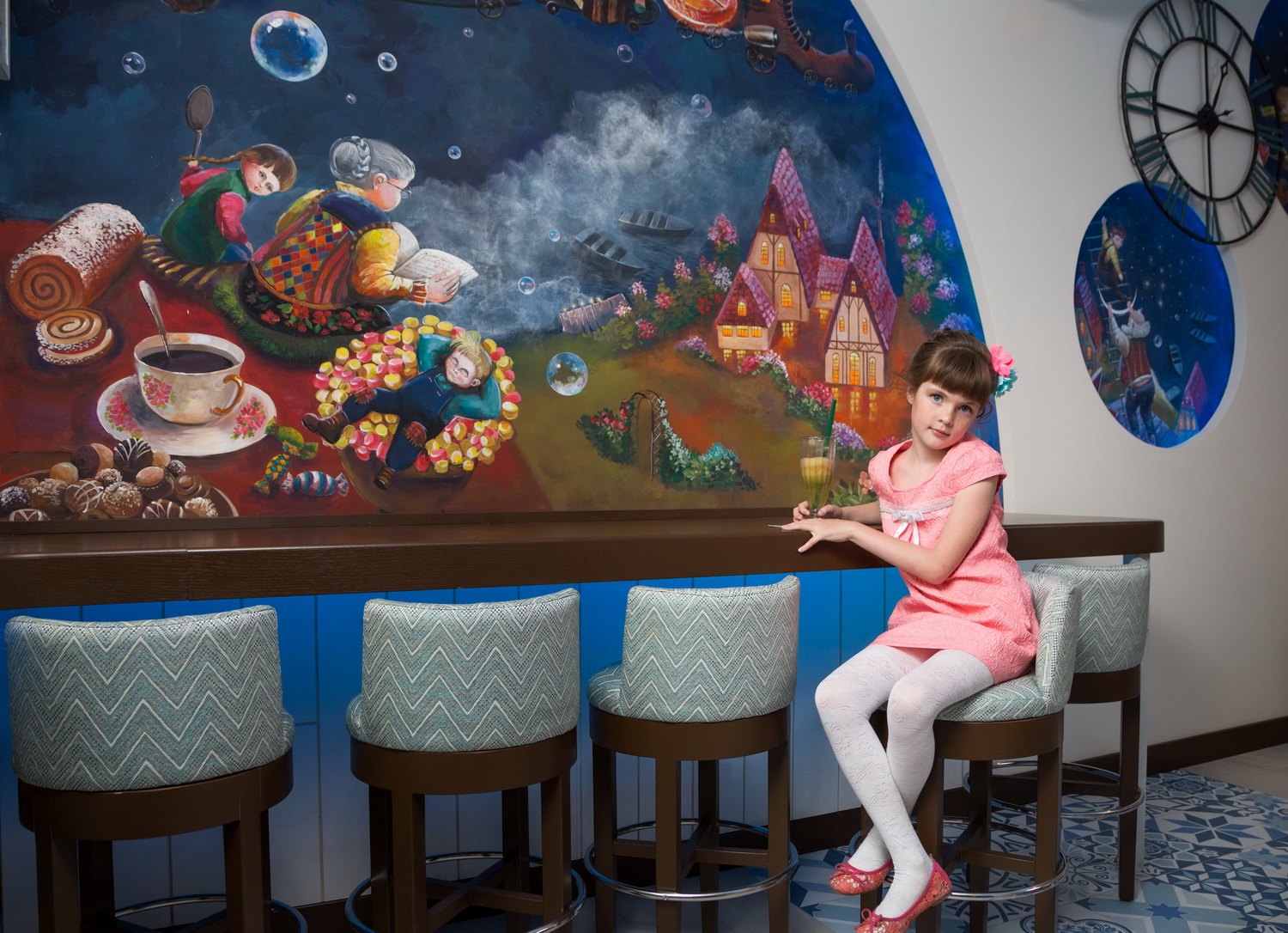 Основной идеей заведения стала зеркальная смена ролей ребенка и взрослого. Ведь при посещении обычного ресторана ключевым моментом является то, что ребенок идет с родителями и является далеко не первым, на кого этот ресторан рассчитан. Да, у него есть детский стул, лист с детским меню и игровая комната с аниматором, но, как правило, в середине вечера ребенку это надоедает, и родители вынуждены покидать заведение. Здесь же главное, вокруг чего крутится весь замысел, – это РЕБЕНОК. Основной упор в обслуживании сделан именно на вашу «кроху». С ним здороваются первым, именно его спрашивают, за каким столом он хочет устроиться и что из меню попробовать. Вся концепция заведения ориентирована на приятное и полезное времяпрепровождение вашего малыша, поэтому вы абсолютно спокойно можете оставить свое чадо в опытных руках персонала заведения и отправиться по своим делам.