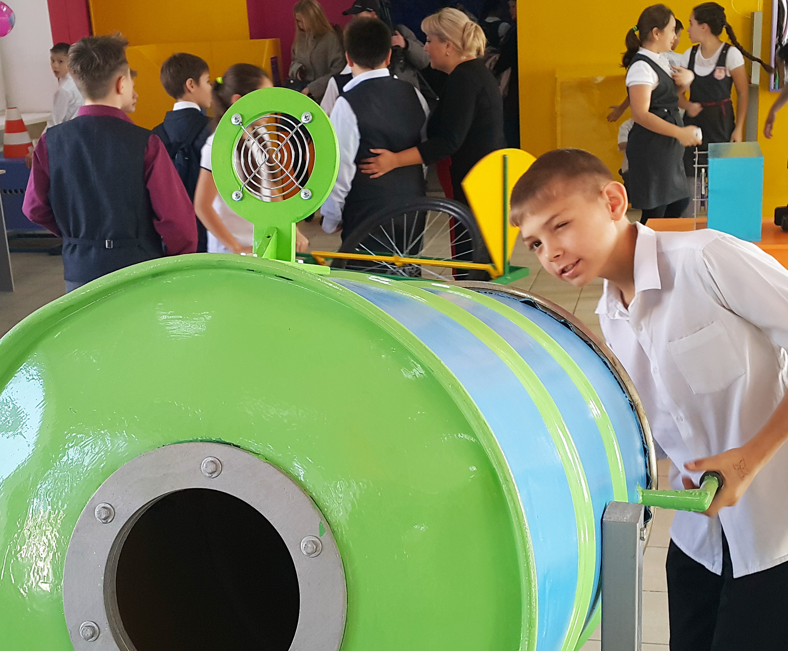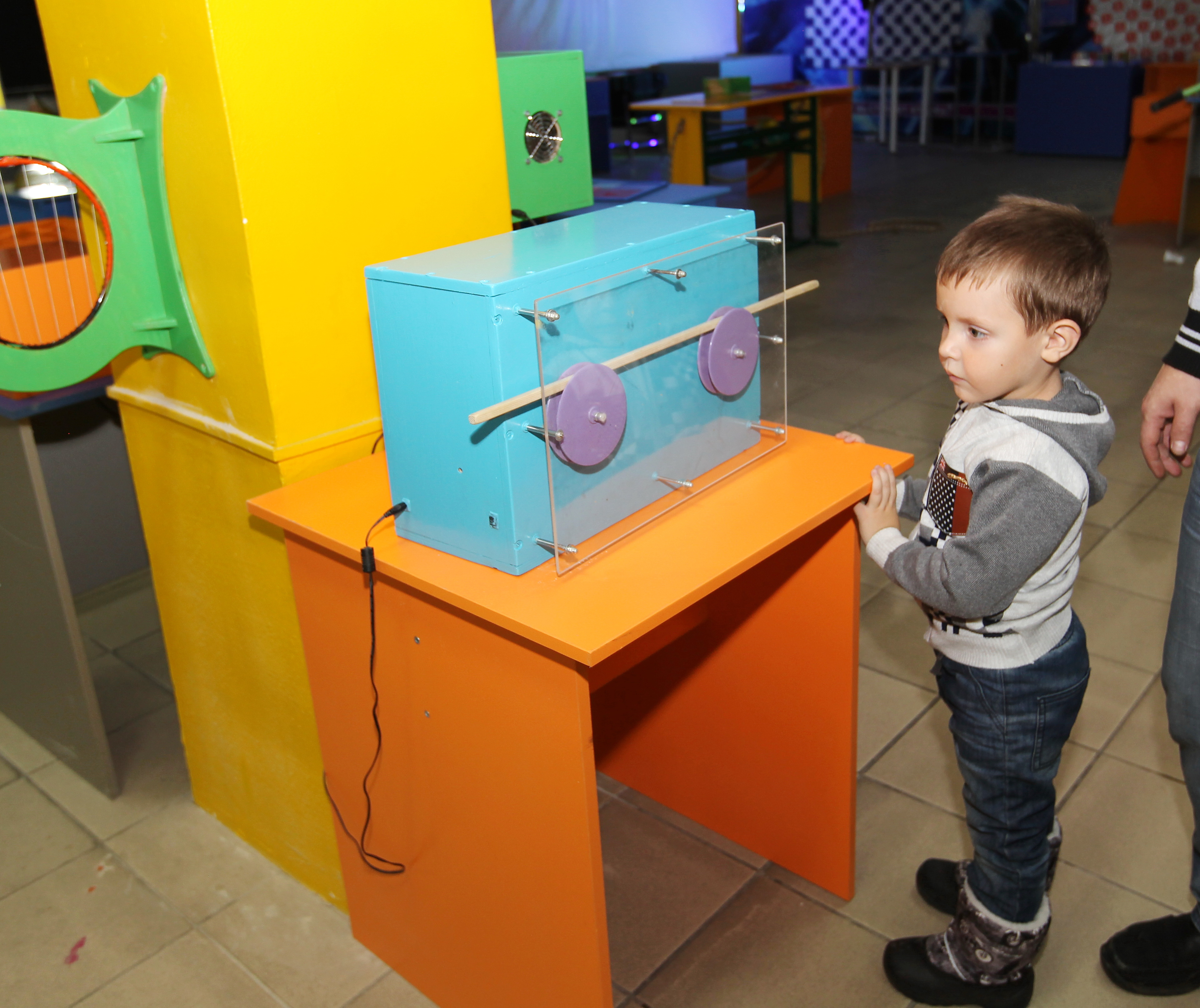 Живой интерес к экспонатам выставки проявляют не только дети – пришедшие с ними родители, бабушки и дедушки радуются не меньше, и сами с удовольствием все испытывают на себе.