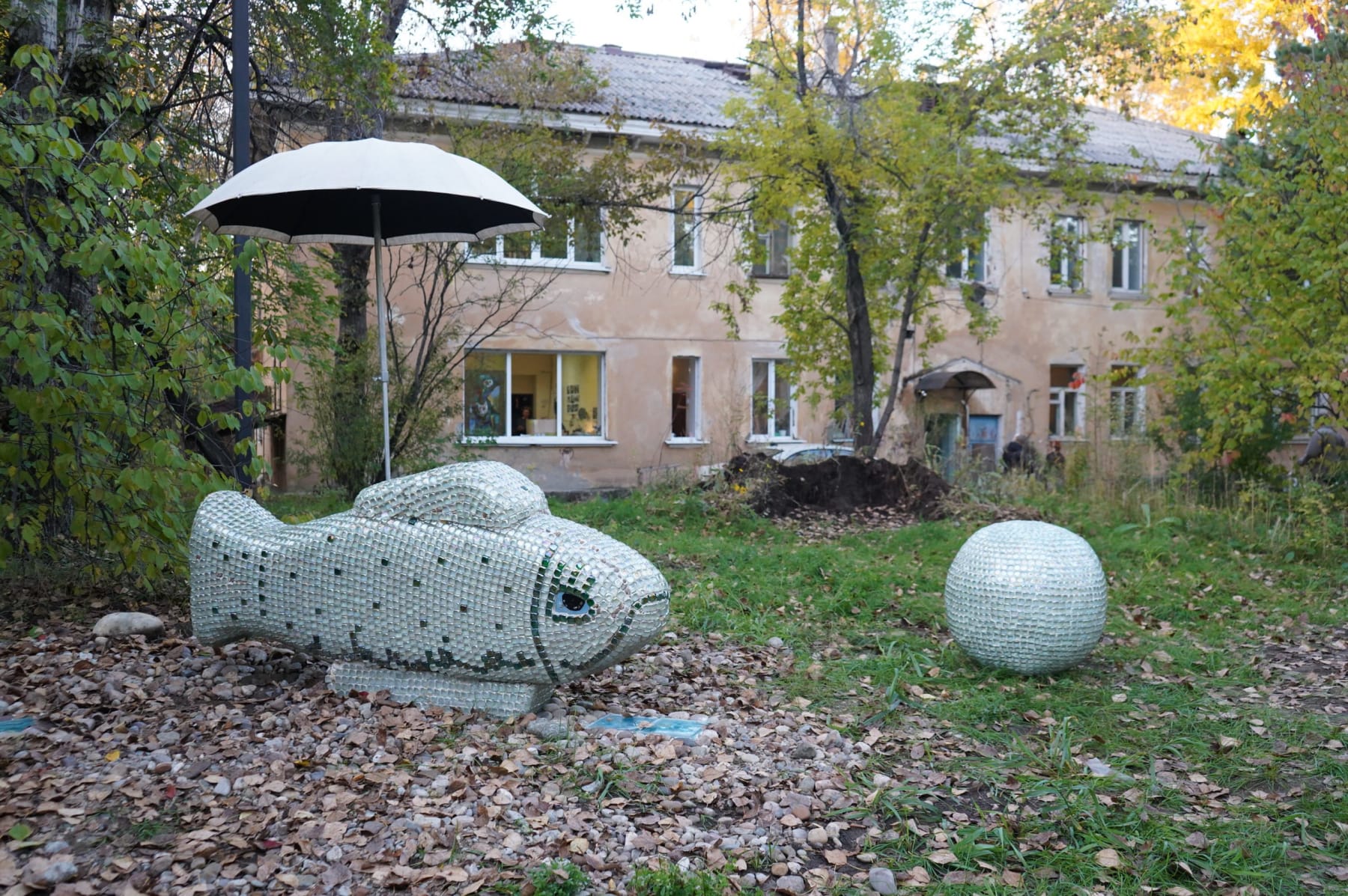 Одну из скульптур в парке сделала визуальный художник Елена Аносова. Это огненная лисица из витражного стекла с омулем подмышкой.