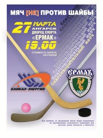 27 марта во дворце спорта «Ермак» состоится товарищеский матч «Мяч не против шайбы» между командами «Ермак» и «Байкал-Энергия». Противостояние команд будет носить благотворительный характер – все вырученные средства будут направлены на приобретение спортивного инвентаря в детские дома города Ангарска и Иркутска. Цена билета – 100 рублей. Начало в 19 часов.